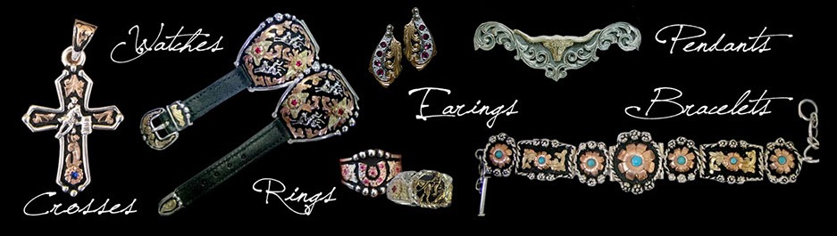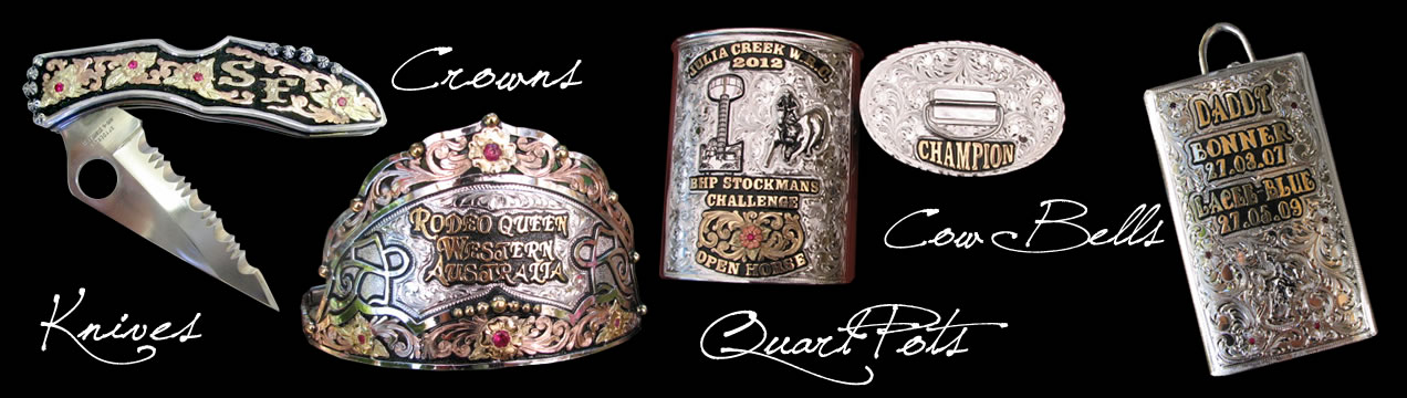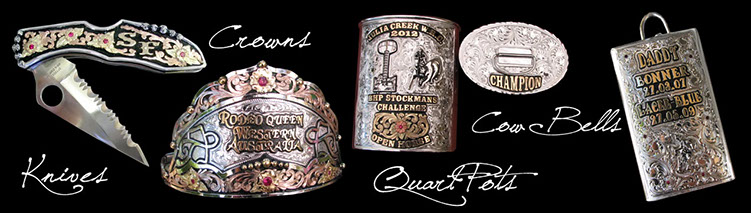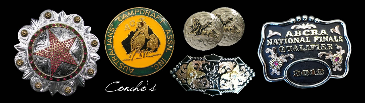 Ridetuff also carry a large assortment of hand made trophy items that can be made with real gold on sterling silver bases, gold plated or jewellers gold on German silver bases. Some of these items are Conchos, Money Clips, Name Plates, Key Holders, Hat Badges, Logos, Figures, Crosses, Pendants, Knife Plates, Spurs, as well as a wide range of designed and Hand made Jewellery to suit all tastes.