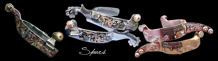 In stock we have a variety of different shaped bases for our buckles and 3 piece sets, these are all small enough for bridles or spur straps. Spurs can also be made with original or matching buckle designs. A large variety of coloured stones, real gems and diamonds can be added to the individual design, once again budget will determine this.